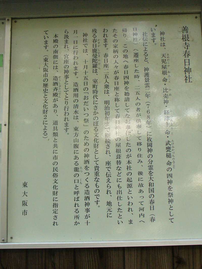 善根寺春日神社 東大阪の生駒西麓にある 善根寺春日神社は、お神酒を 造るという古くからの神事を 継承しています。大阪府では、 善根寺春日神社だけと聞いて おります。 |