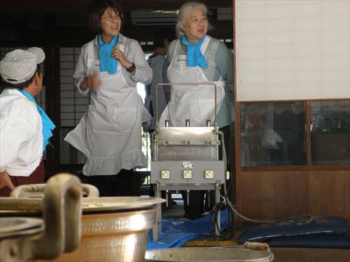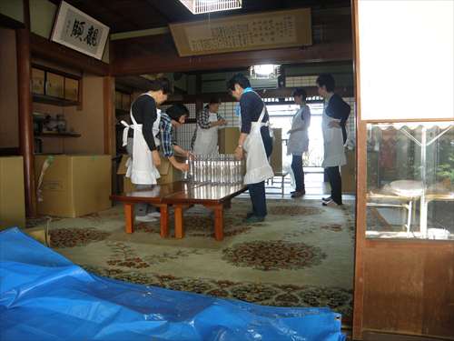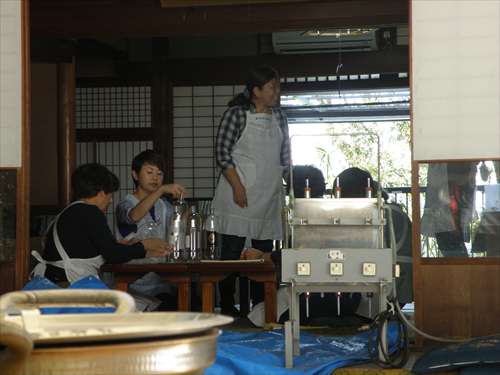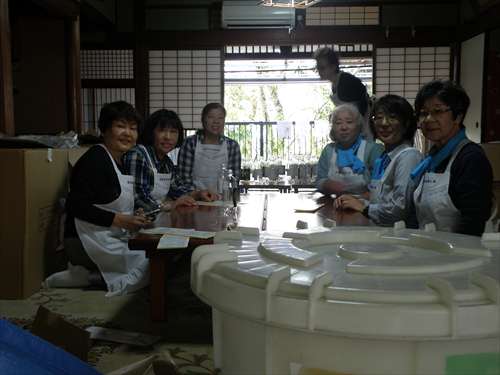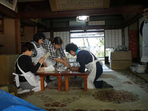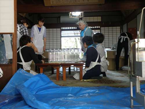 婦人部で、出来上がりの濁り酒をペットボトル のラベルの貼り付け作業です。 |