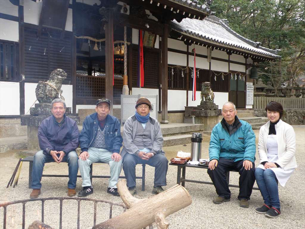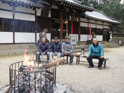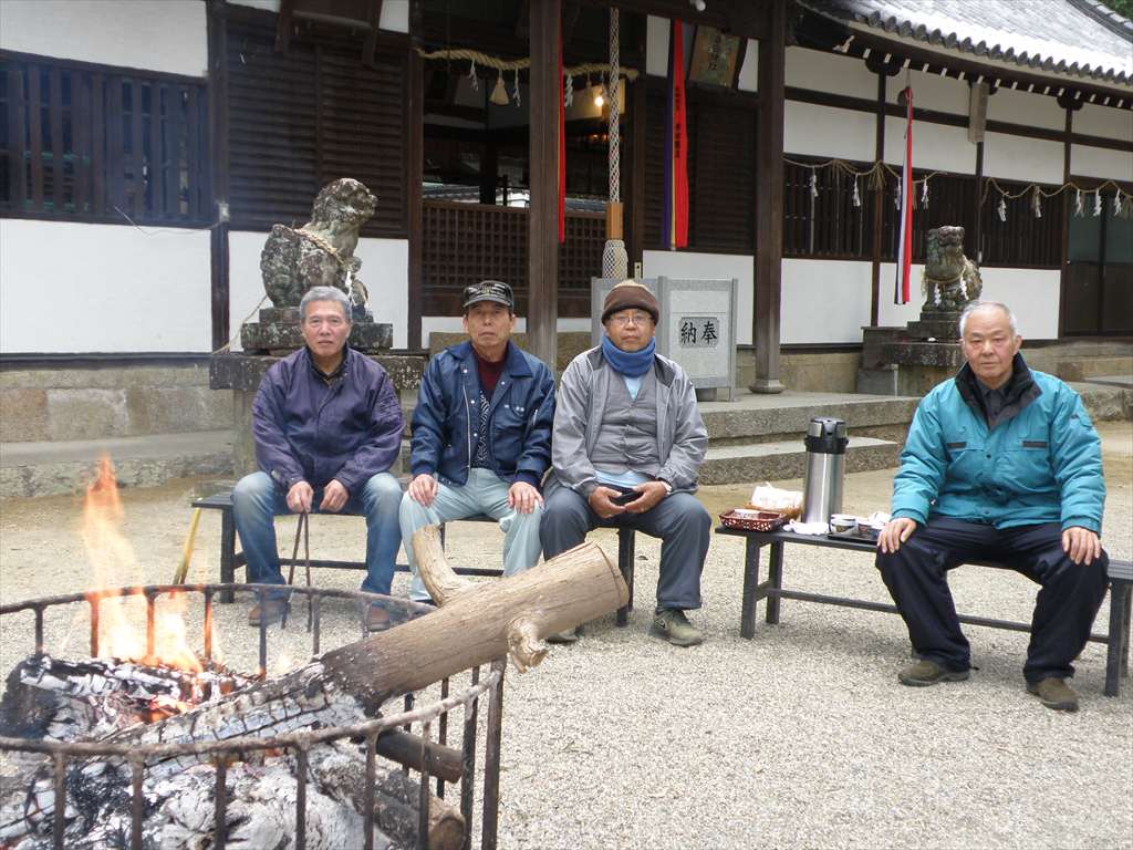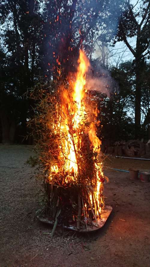 敬神会 会長 山内 勇二 竹を主材料に,円柱状,あるいは円錐形,方形などに組み,中心の心竹に,御幣に相当する飾りや縁起物を付け,正月の松飾り・注連縄(しめなわ)・書き初めなど一緒に焼く。とんど焼きのは灰は魔除け、厄除けの力があり、家の周りに撒くと良いともされています。日本全国に伝わるお正月の火祭り行事です。 |