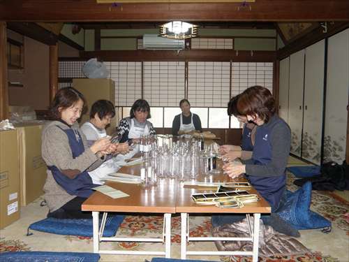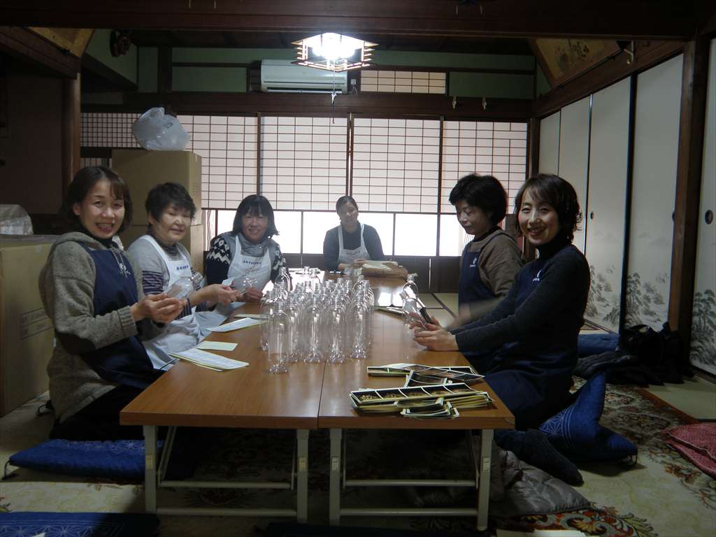 敬神会 婦人部です ペットボトルにラベルの貼り付け作業です |