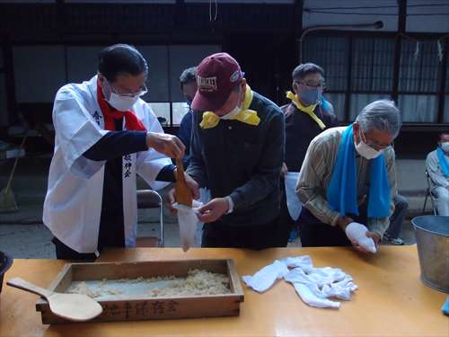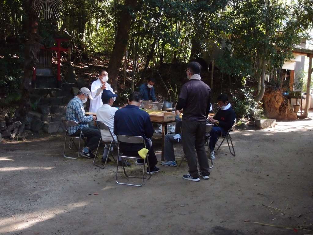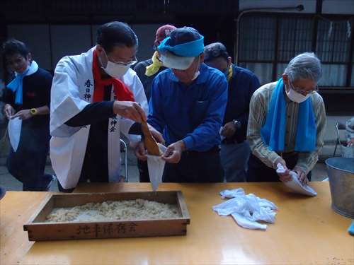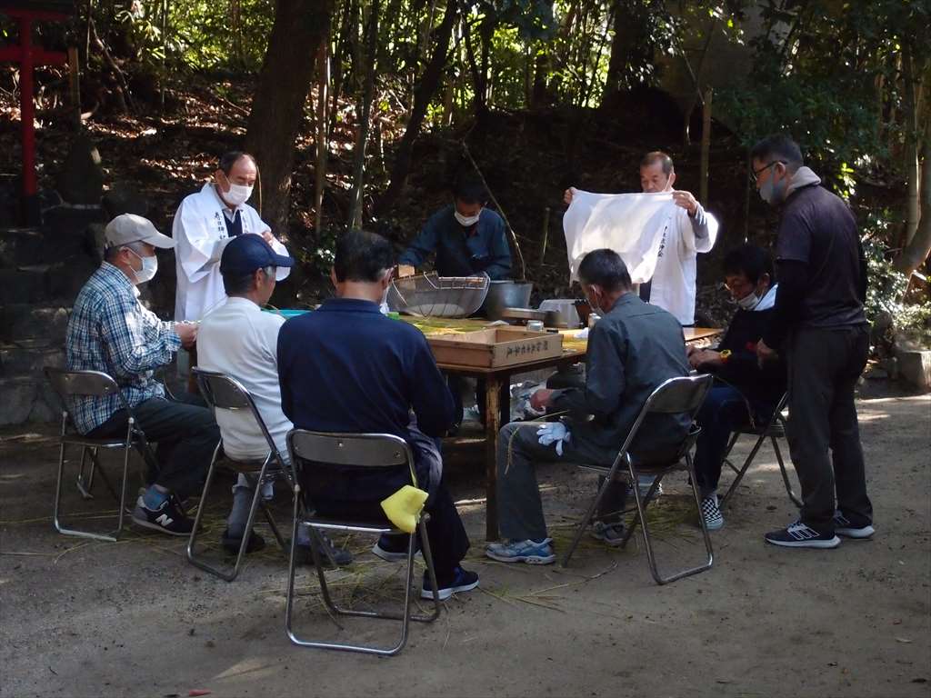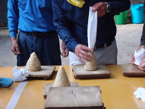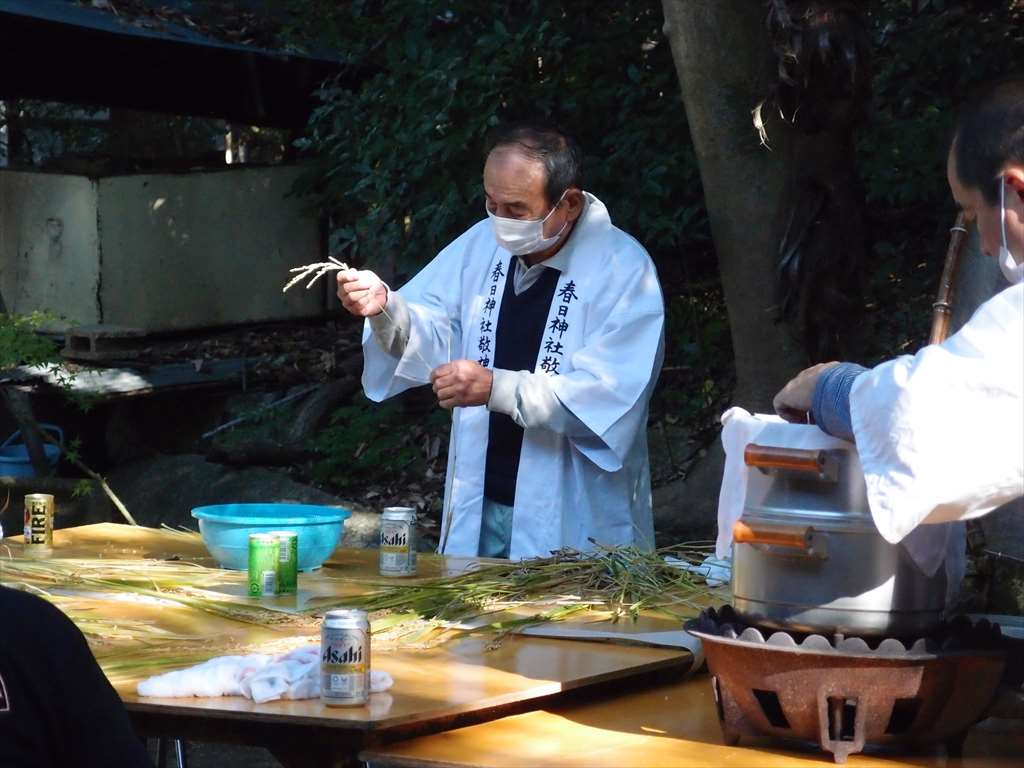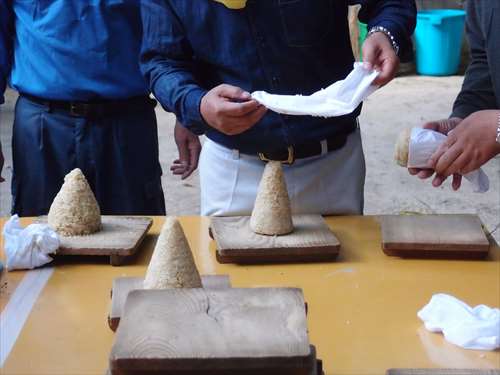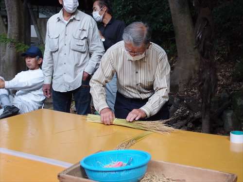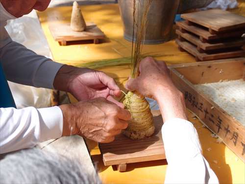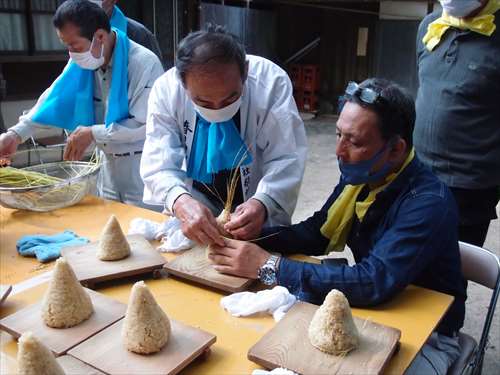 うるう玄米を蒸して、布に包んで円錐形に整え、その周囲を稲穂で12段(うるう年は13段)巻いたものです。16個造り、神饌・鏡餅と一緒に神殿と祭殿にお供えします