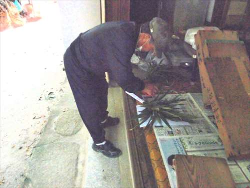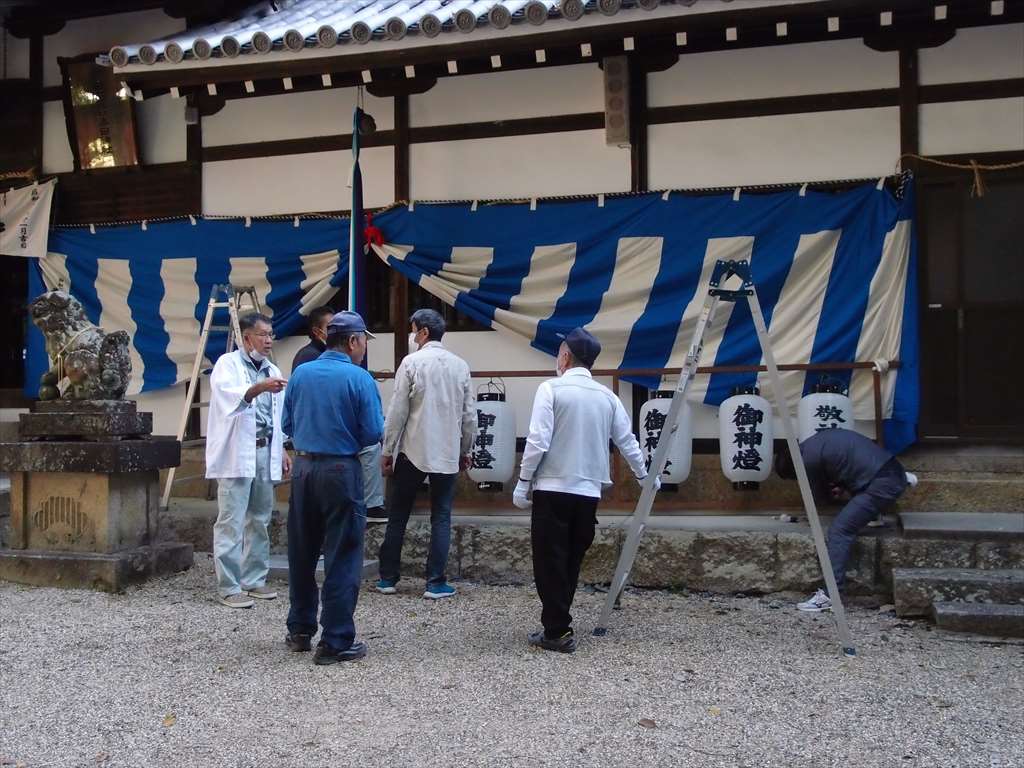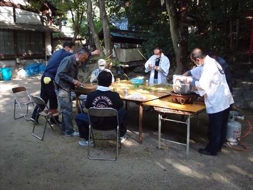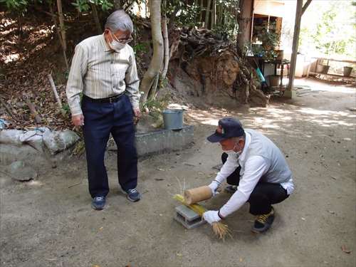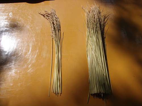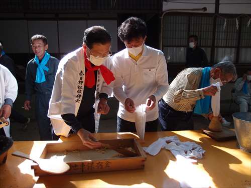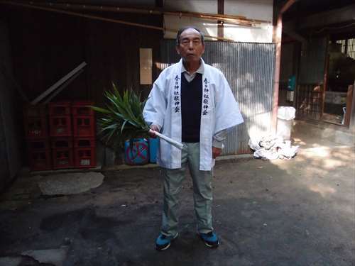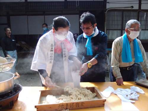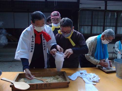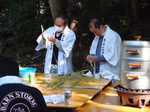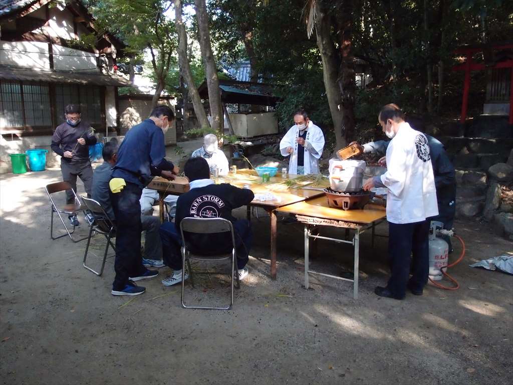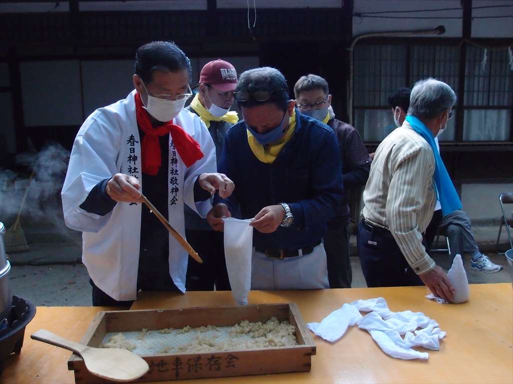 うるう玄米を蒸して、布に包んで円錐形に整え、その周囲を稲穂で12段(うるう年は13段)巻いたものです。16個造り、神饌・鏡餅と一緒に神殿と祭殿にお供えします