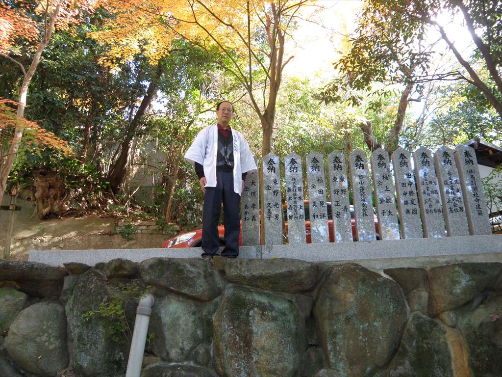 宮座主名左より 山口元 竹内秀次 大川孝義 松佑吉 奉納品 ブロー 2台 チェンソオ 2台 インパクト 1台
