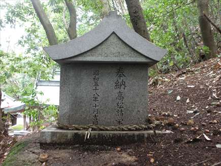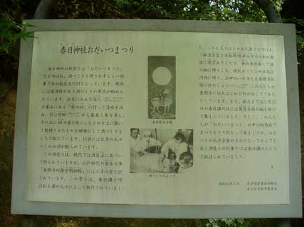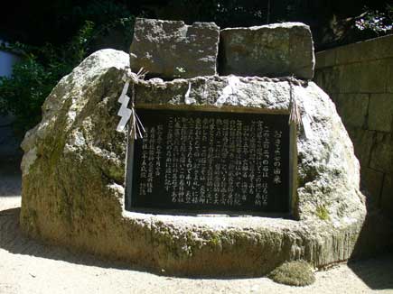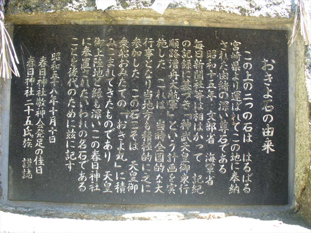 この上の二つの石は、はるばる宮崎県より運ばれてこの地に奉納された由緒の深い尊石である。昭和15年、文部省、海軍省、毎日新聞社等は相はかって、記紀の記録に基づき「神武天皇御東行順路漕舟大航軍」という計画を実施した。これは、当時全国的な大行事となり当地方も積極的に之に参加した。この石こそは、天皇御乗船おみたての「おきよ丸」に積みこまれてきたものであり、天皇御上陸地と縁も深いこの春日神社に奉置されたいわれの名石であることを後代のために茲に記す。