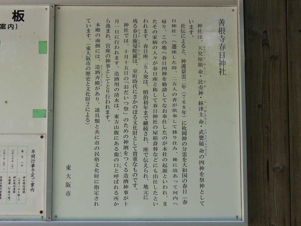善根寺春日神社は明治五年(1872)に「枚岡神社」に合祀され、 明治十四年(1881)に複社していますが、かつて境内には神宮寺