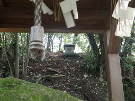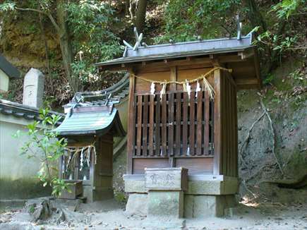 本殿隣に苔生した磐座があり、玉垣で囲われている |